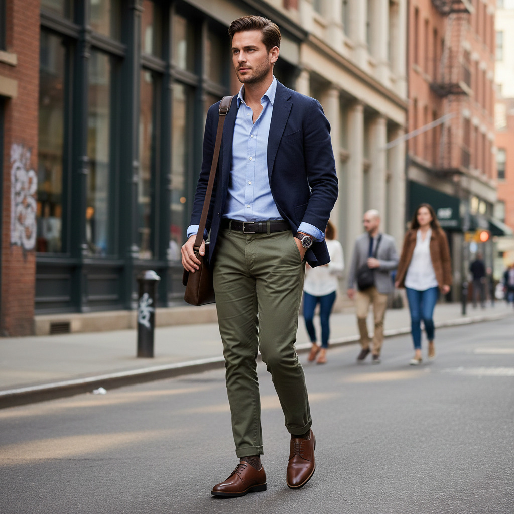 Para ocasiões menos formais, o Derby Logan mostra sua versatilidade. Ele funciona muito bem com calças chino em tons de bege, cáqui, azul ou verde-oliva, acompanhadas de camisas casuais ou camisetas de boa estrutura. O contraste entre o visual mais descontraído das roupas e o acabamento refinado do calçado cria uma composição moderna e sofisticada.