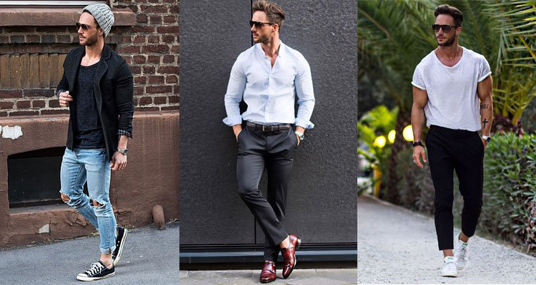 - Estilo urbano: tênis branco minimalista, jeans slim azul e camiseta básica preta.